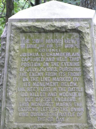 Marker on location where the 20th Maine under the command of Col. Joshua L. Chamberlain captured and held the position.